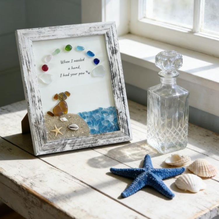 Cuando las palabras no sean suficientes para expresar la pérdida de un amigo peludo, deja que esta obra de arte artesanal de vidrio marino hable por ti. Con el conmovedor mensaje: "Cuando necesitaba una mano, tenía tu pata", esta singular caja de sombras captura el vínculo eterno entre tú y tu mascota en el Puente Arcoíris.