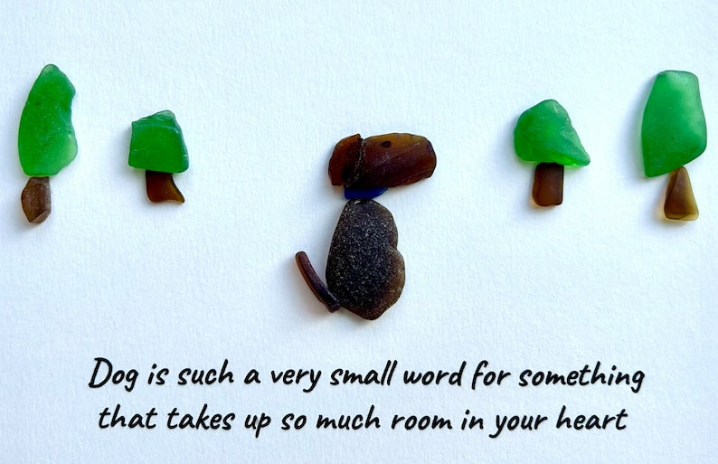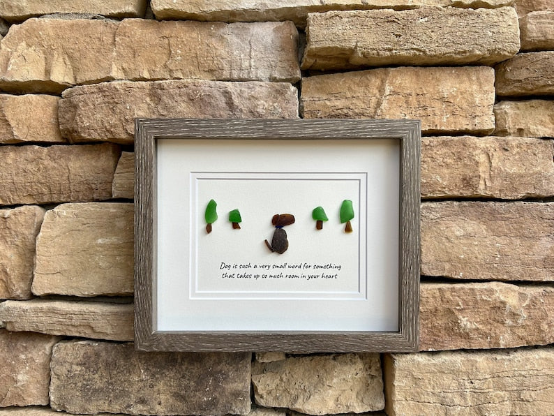 Esta obra de arte bellamente hecha a mano combina vidrio marino natural y guijarros para crear una pieza única y conmovedora, perfecta para cualquier dueño de perro.
