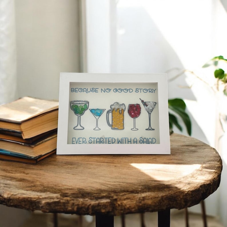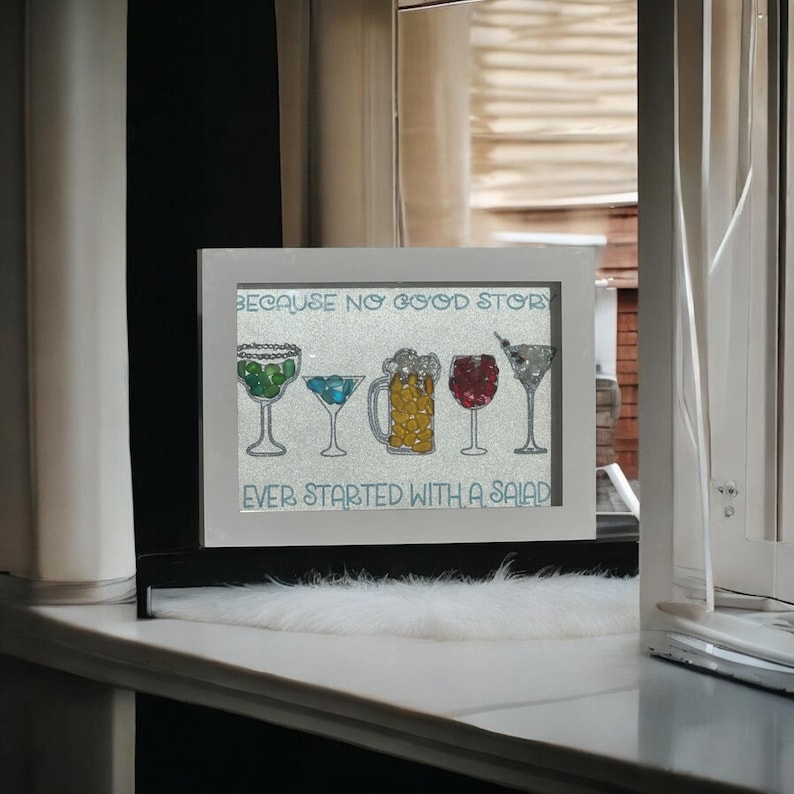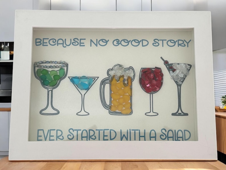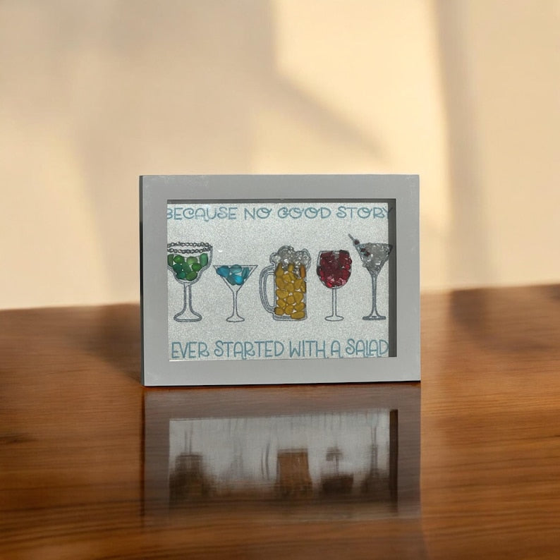 Con cócteles de vidrio marino y una cita divertida, cada pieza está hecha a mano con vidrio marino único, lo que agrega un toque de encanto costero a su decoración.