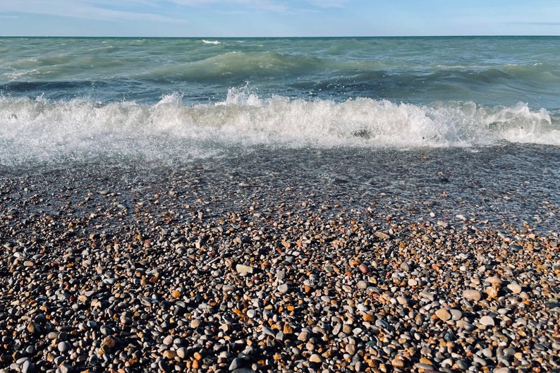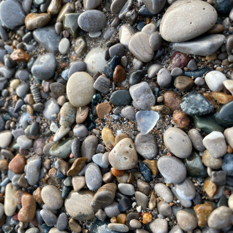 Hecho con vidrio marino, madera flotante y guijarros que mi familia y yo recogimos de la orilla. Cada pieza de vidrio marino es única; de alguna manera, llegó al lago como un trozo de vidrio y luego fue arrastrada por las fuertes olas hasta convertirse en un pequeño tesoro que llegó a la playa. Aunque la mayoría de las piezas están lisas, algunas presentan muescas o rayones que reflejan su viaje hasta la orilla.